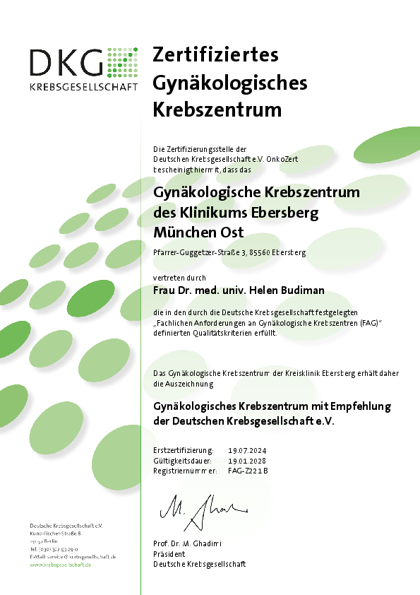 Das Gynäkologische Krebszentrum des Klinikum Ebersberg München Ost, zertifiziert durch OnkoZert gemäß den Richtlinien der Deutschen Krebsgesellschaft, bietet eine umfassende und interdisziplinäre Versorgung für Patientinnen mit gynäkologisch-onkologischen Krankheitsbildern.